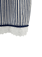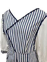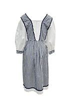 Navy stripes on tan cotton Maid's dress with above-calf skirt, lower waist, above elbow sleeves in ivory cotton, eyelet lace hem, pleated waist, blue ruffle trim on bodice and hem.