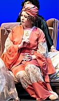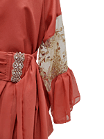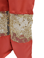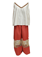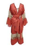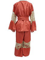 Tangerine colored lounge-wear set with 5 pieces, wrap jacket with sheer metallic gold panels and long chiffon bell sleeves, long straight leg lounge pants with elastic waistband and sheer metallic gold panels, ivory satin, camisole with rose gold and rhinestone trim at neckline, pleated chiffon belt with rose gold and rhinestone trimmed band/closure, and period-style turban with rose gold and rhinestone trim detailing.