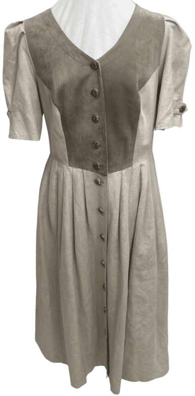 Tan dress with darker brown suede detail on bodice.