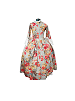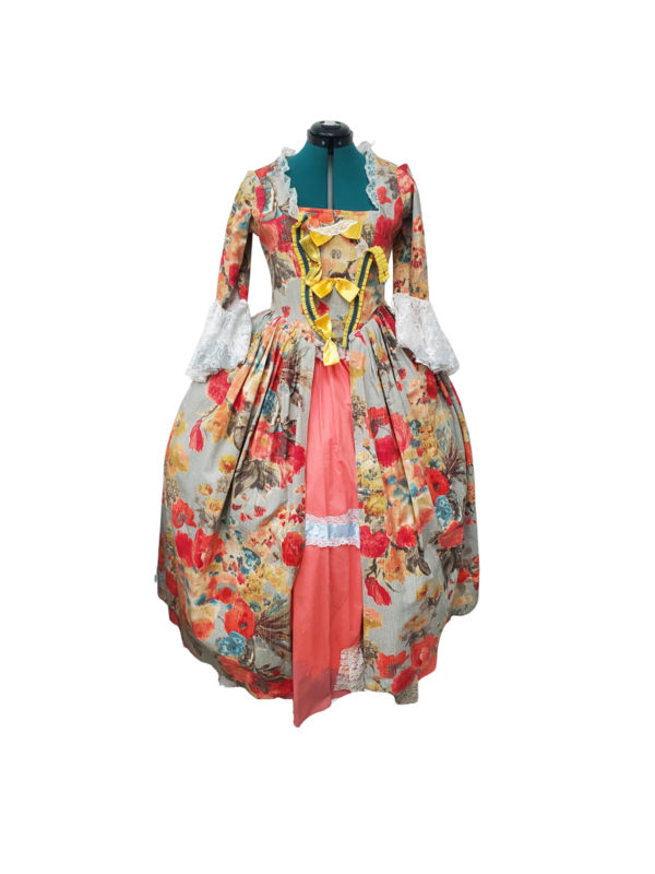 Light blue and coral 18th century overdress with floral watercolor print, below elbow sleeves with lace cuff, yellow bows on stomacher, lace trim, and zipper closure. Skirt and petticoat (used in photos) rented separately.