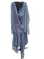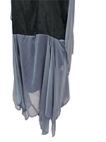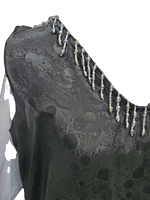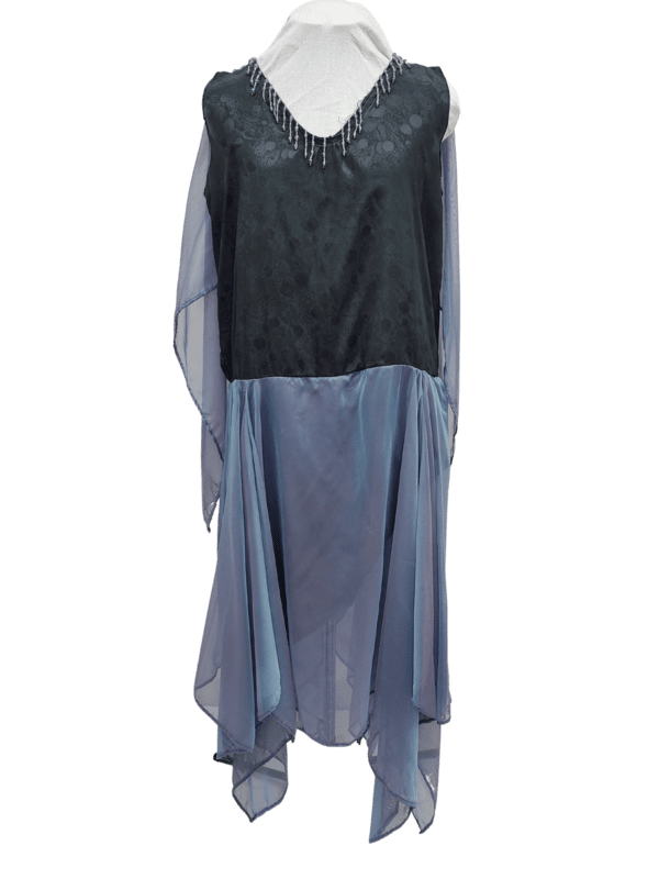 Black box dress in abstract satin brocade, above-calf purple iridescent organza skirt, handkerchief hem, drop waist, draped organza capelet, and beaded trim at neckline.