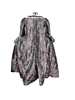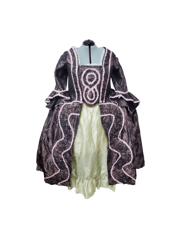 Brown Taffeta Overdress with baby pink embroidery, cape, pink trim, floor length skirt, front open stomacher, and adjustable corset back. Pannier and skirt (shown in photo) rented separately.