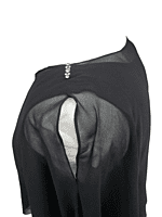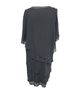 Bias cut black box dress, mid-calf skirt, drop waist, short split sleeve overlay with rhinestone detail, asymmetrical layered skirt, and scoop neck.