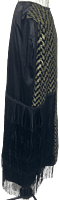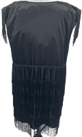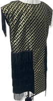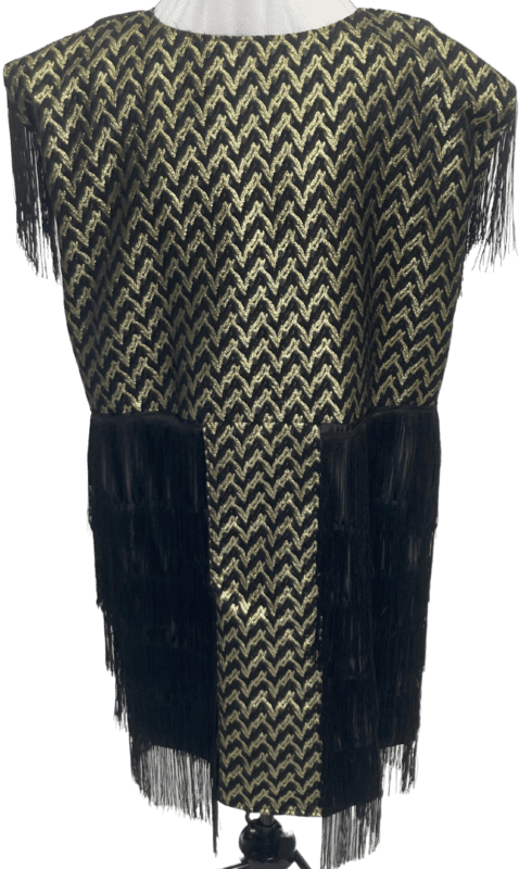 1920's style box dress with metallic gold patterned fabric and black fringe detailing.