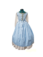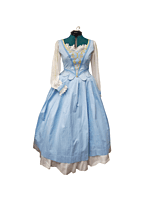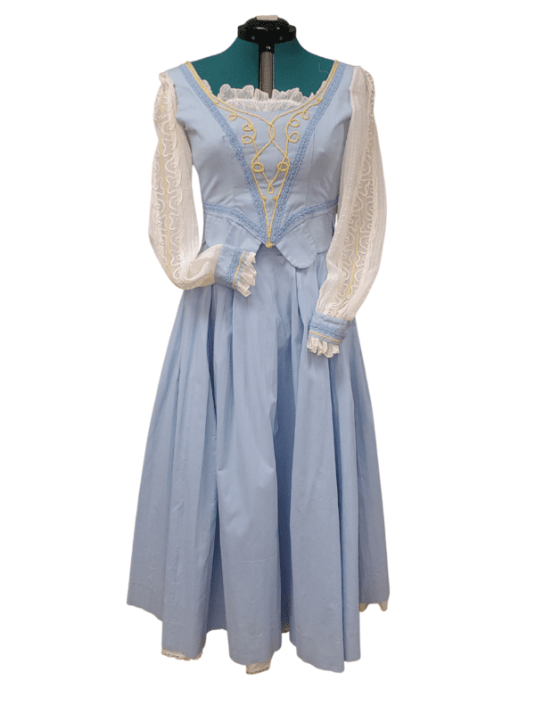 Light blue bodice & skirt set with long lace sleeves and embellished with gold trim. Petticoat (shown in some photos) rented separately.