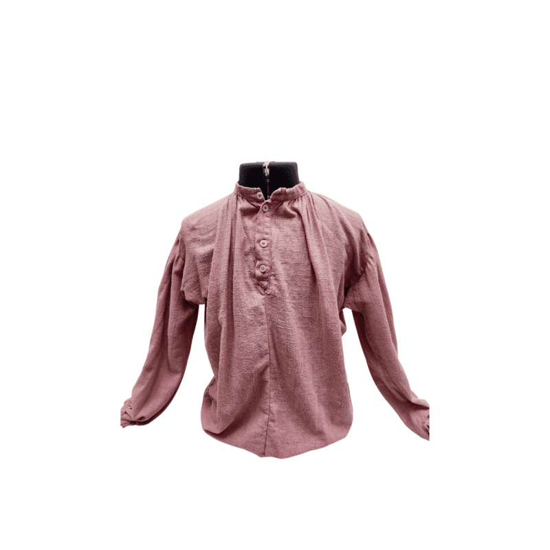 Light pink linen shirt with placket center front and button closures. Sleeves have button closure at cuffs. Underarm has a small triangular gusset for movement. The sizing below represents the measurement when garment is fully stretched out, but will fit nicely on someone with a smaller measurement as well.